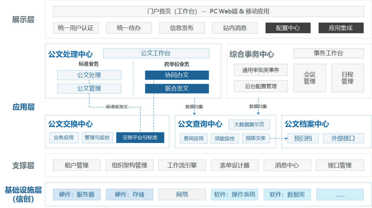 本方案以多租戶“按需開通系統(tǒng)”的方式,采用微服務、模塊化的架構,滿足黨政機關的公文處理中心、公文交換中心、公文查詢中心、公文檔案中心和綜合事務中心的“4+1”中心體系需求,滿足客戶“廣覆蓋、快部署、靈活用”的場景,以“標準+定制”一體化系統(tǒng)實現(xiàn)省、市、區(qū)縣、街、村等5級區(qū)域覆蓋,充分解決了黨政單位/部門“辦公系統(tǒng)繁雜、架構參差、系統(tǒng)不穩(wěn)定、信息不通、信息冗余”等辦公協(xié)作問題,切實提升了黨政單位之間辦公效率和協(xié)作能力,得到了廣大客戶的認可。