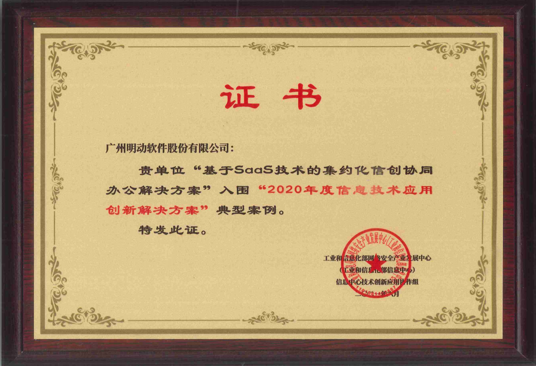在大會上,“2020年度信息技術(shù)應(yīng)用創(chuàng)新典型解決方案”名單隆重揭曉、正式發(fā)布,明動軟件基于SaaS技術(shù)的集約化信創(chuàng)協(xié)同辦公解決方案從143家企業(yè)單位、268個解決方案中脫穎而出,成功入圍2020年政務(wù)組信創(chuàng)協(xié)同辦公解決方案典型案例。與此同時我司作為廣東省內(nèi)唯一的協(xié)同辦公解決方案廠家入選。