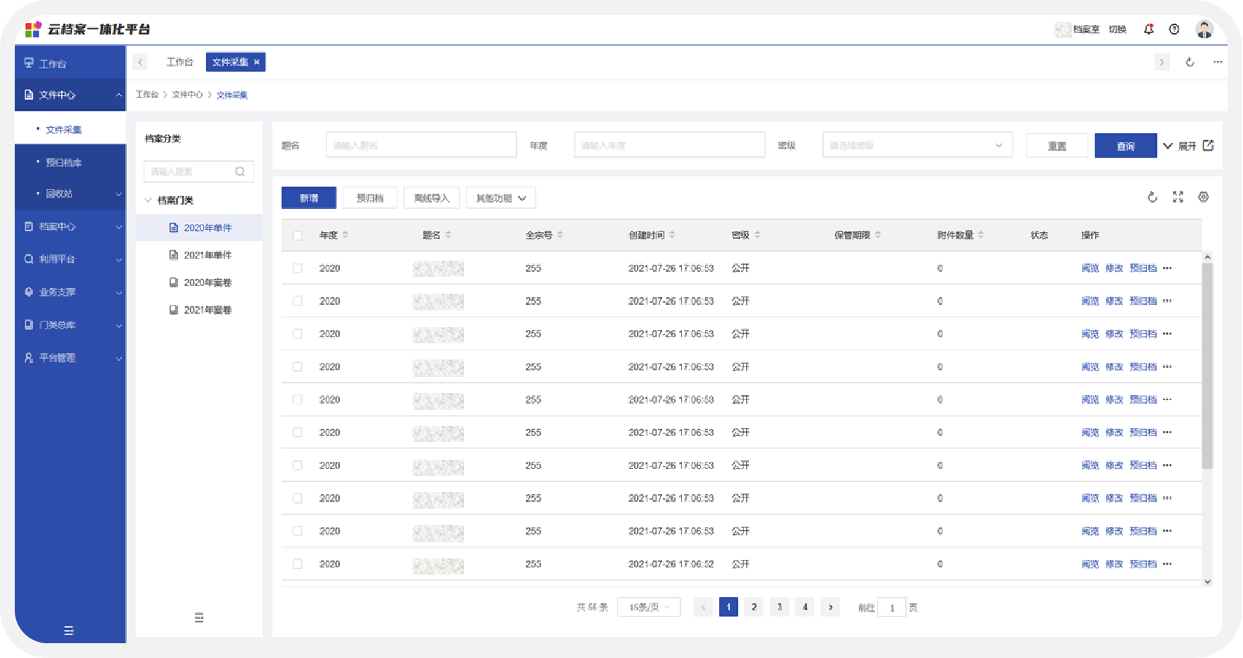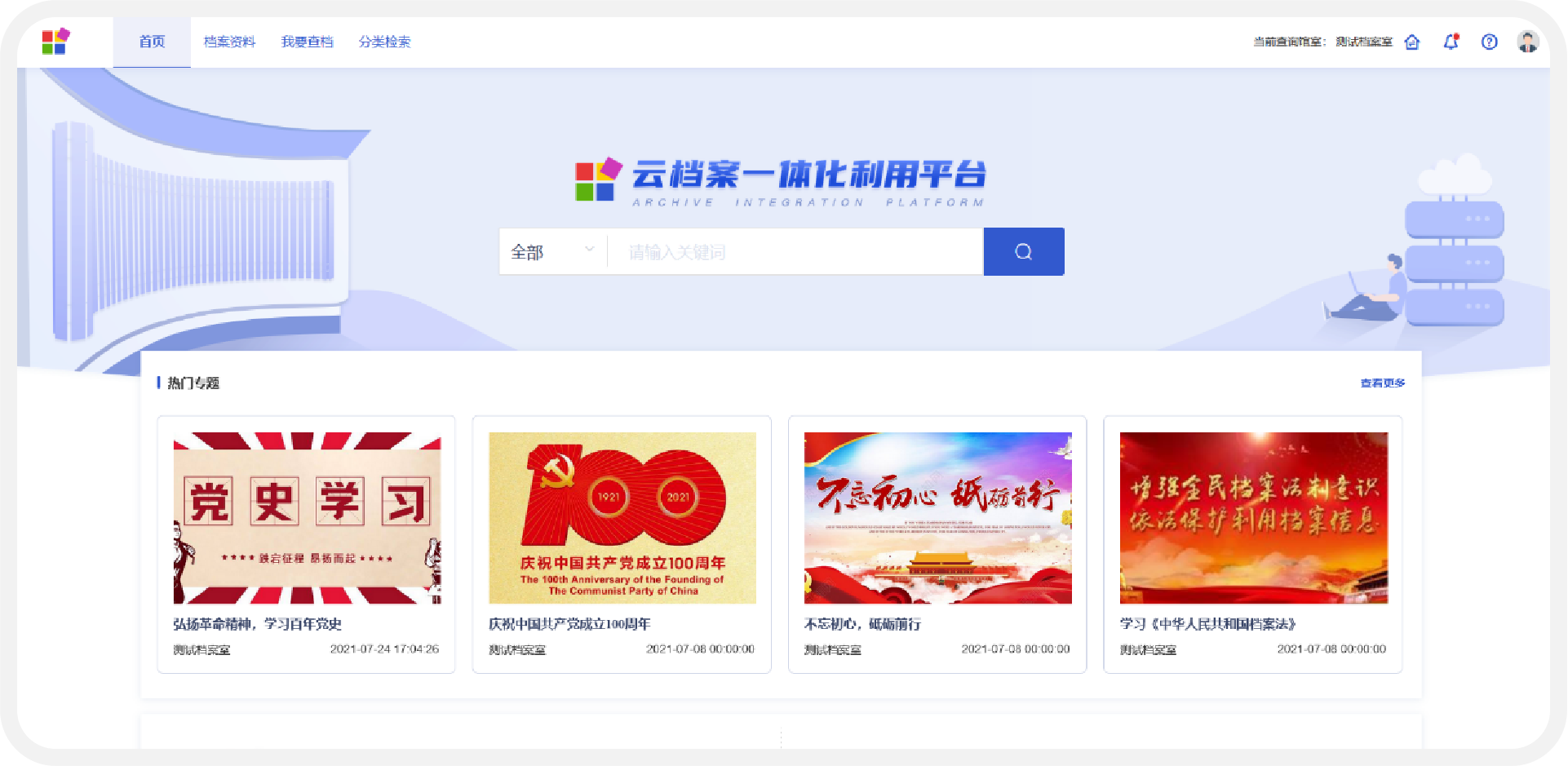 云檔案一體化平臺以集約化管理的理念,基于"集約部署、統(tǒng)一管理、分級應(yīng)用"的原則,面向各級綜合檔案館、行政機關(guān)、企事業(yè)單位,提供一套全面完整的檔案管理解決方案。結(jié)合國家最新檔案法規(guī)制度和標(biāo)準(zhǔn)規(guī)范,實現(xiàn)對各類檔案資源進行統(tǒng)一收集、管理、保存、利用,促進檔案資源數(shù)字化、管理規(guī)范化、利用便捷化。