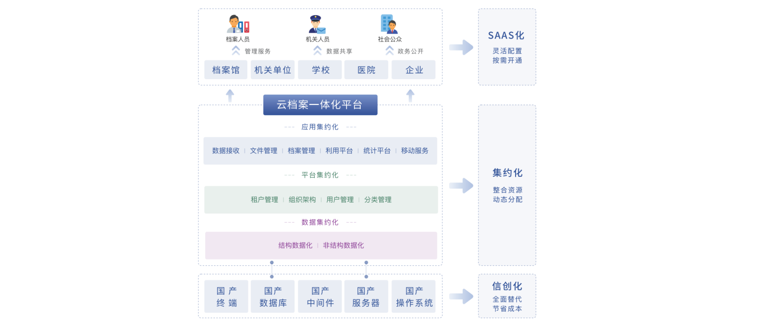 通過一套SaaS化檔案平臺,各單位通過網(wǎng)絡(luò)開通即用,無需關(guān)心檔案系統(tǒng)的開發(fā)、部署、測試、上線、運維、數(shù)據(jù)備份與保護、升級等,可專注自己的業(yè)務(wù)領(lǐng)域。